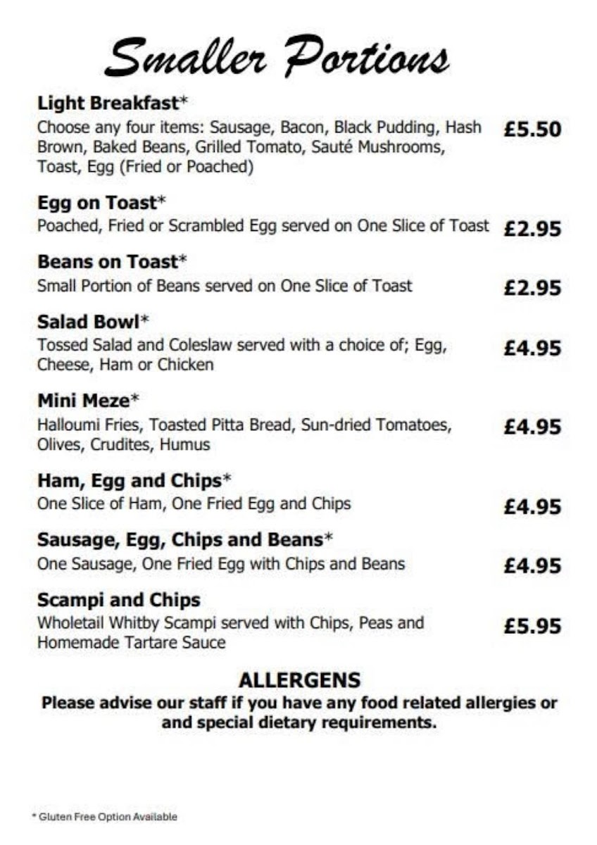 Choose any four items: Sausage, Bacon, Black Pudding, Hash Brown, Baked Beans, Grilled Tomato, Sauté Mushrooms, Toast, Egg (Fried or Poached)